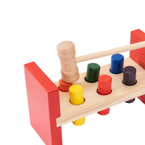 À l’aide du petit marteau, l’enfant s’amuse à frapper les chevilles colorées pour les faire entrer dans le banc, puis recommence du côté opposé.